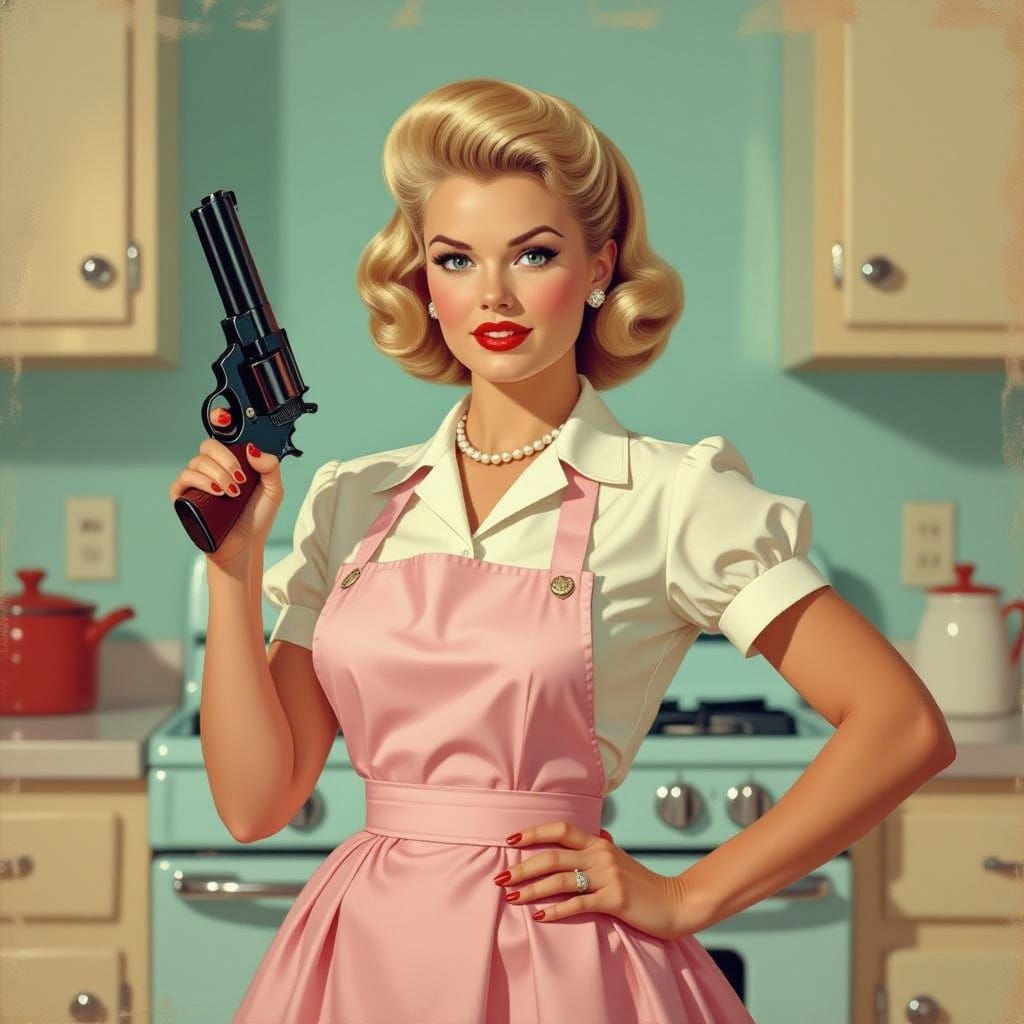 This image depicts a 1950s housewife with a bold expression, holding a six-shooter pistol in a pastel-colored kitchen, inspired by the retro aesthetic of pulp fiction illustrations