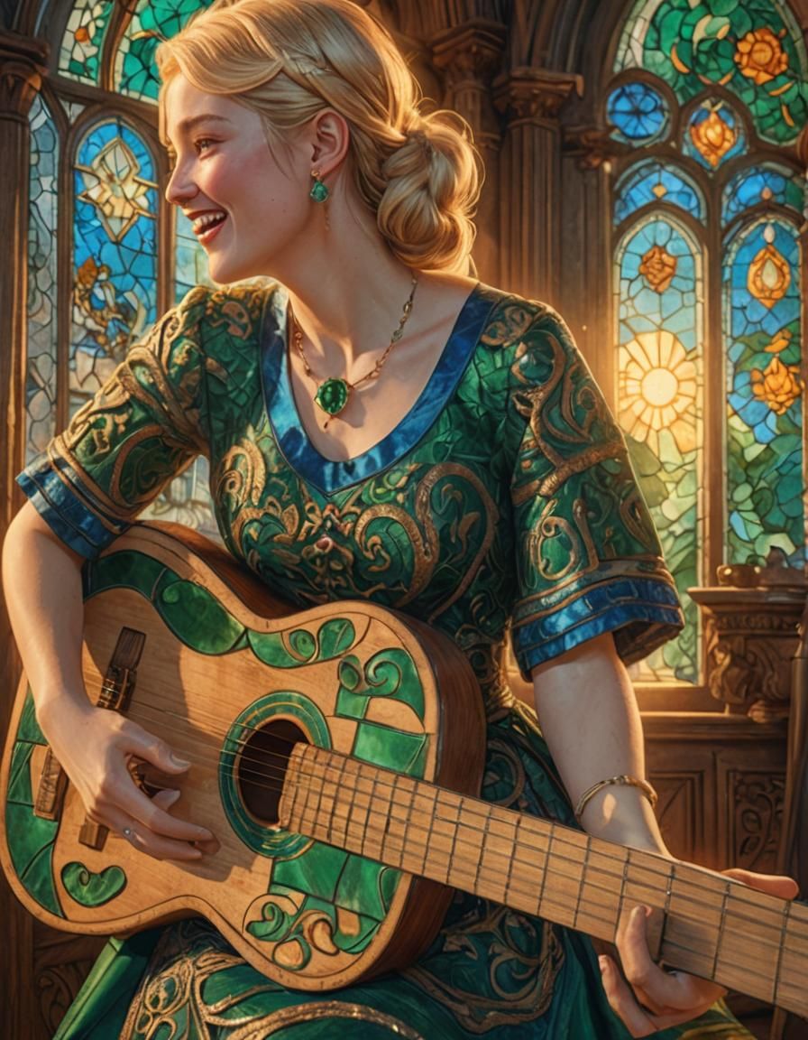 A detailed painting of a blonde girl in a vintage dress playing guitar. A man laughs in the background, set in a sunlit vintage living room. Rendered with deep color and intricate detail.