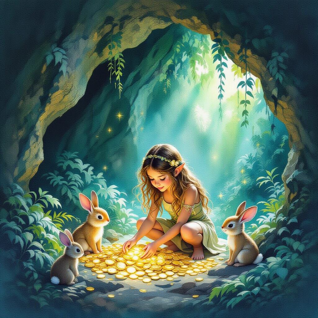 This image shows a jungle girl discovering hidden gold in a secret cave, surrounded by friendly animals in an enchanted forest. Rendered in a dreamy watercolor style with soft, ethereal lighting.