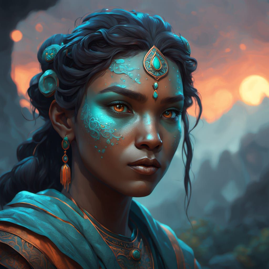 A striking portrait of a fantasy being with unique coloring. Soft lighting and ethereal mist enhance the subject's features in this hyperrealistic digital artwork. The art style is reminiscent of fantasy concept art.