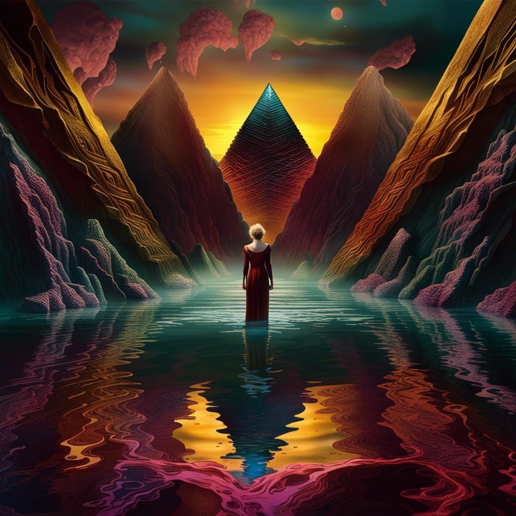 A surreal image showing a siren and a shepherd boy in a river. The artwork has deep colors and intricate details, with a fantastical, matte painting aesthetic.