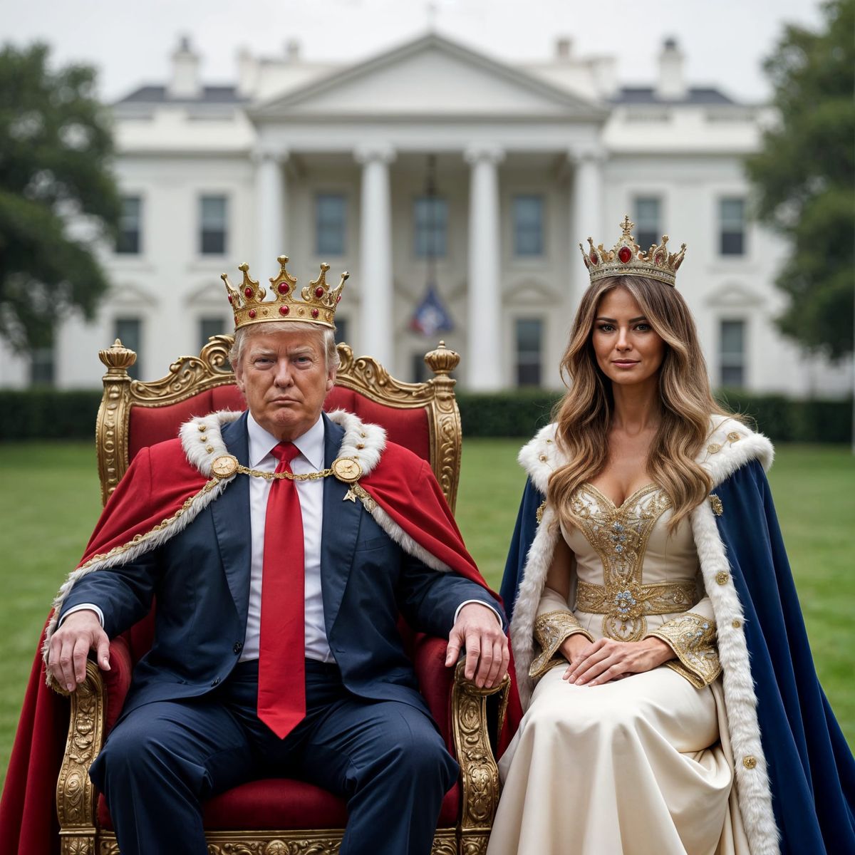 This image depicts Donald Trump and Melania in regal attire, seated on a throne with the White House in the background. They are portrayed as king and queen.