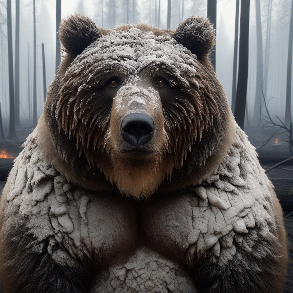 This image shows a heroic park ranger, Smokey the Bear, amidst a burning forest, with a sarcastic expression and a flour-dusted fur, set against a warm and golden cinematic backdrop with deep shadows.