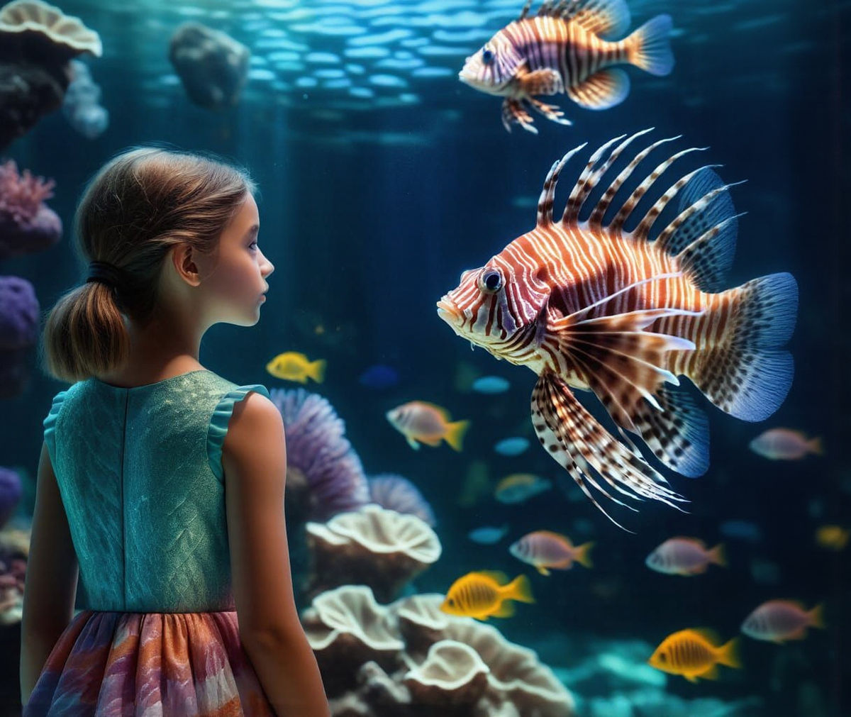 This image shows a young girl in a colorful dress gazing at lionfish in a large aquarium. The photorealistic image captures the wonder of marine life.