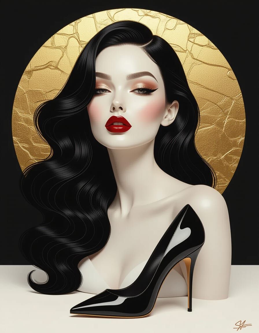 This surreal 3D close-up digital artwork portrays an elegant woman with porcelain skin, bold red lips, and flowing black hair contrasted against a minimalist black background. A textured golden circle resembling a moon and a shimmering golden high-heel shoe blend seamlessly into the composition, symbolizing beauty, elegance, and mystery. With intricate details, hyper-realistic shading, and luxurious contrast of black, white, gold, and red, this artwork is perfect for lovers of surreal portraits, modern glamour, and digital fantasy art.