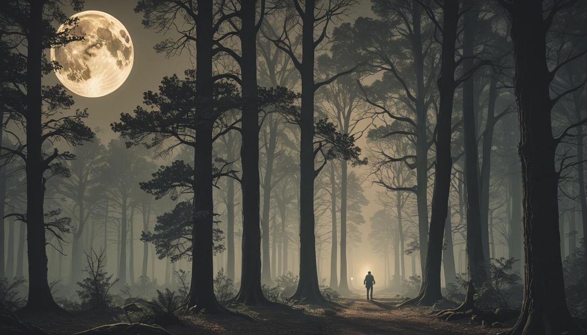 This image shows a tranquil, moonlit forest with long shadows, evoking a sense of nostalgia and mystery. The scene includes a glowing moon and subtle hints of otherworldly elements, reminiscent of 1980s film.