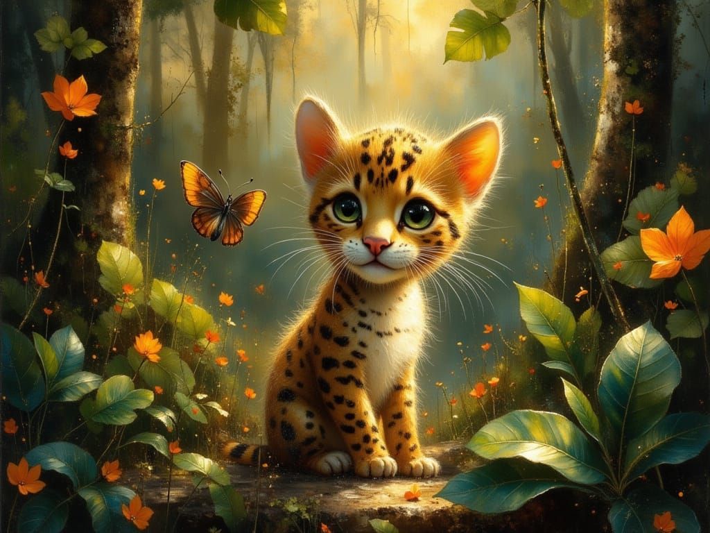 A hyperrealistic 16k photograph of a cute baby jaguar with a butterfly on its nose, set in a lush Amazonian jungle during golden hour. Evokes naturalism and documentary style.