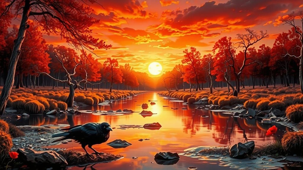 A striking picture of a solitary crow perched by a river at dusk. The scene is rendered as an impasto painting with surreal colors, conveying a gothic and melancholic atmosphere.