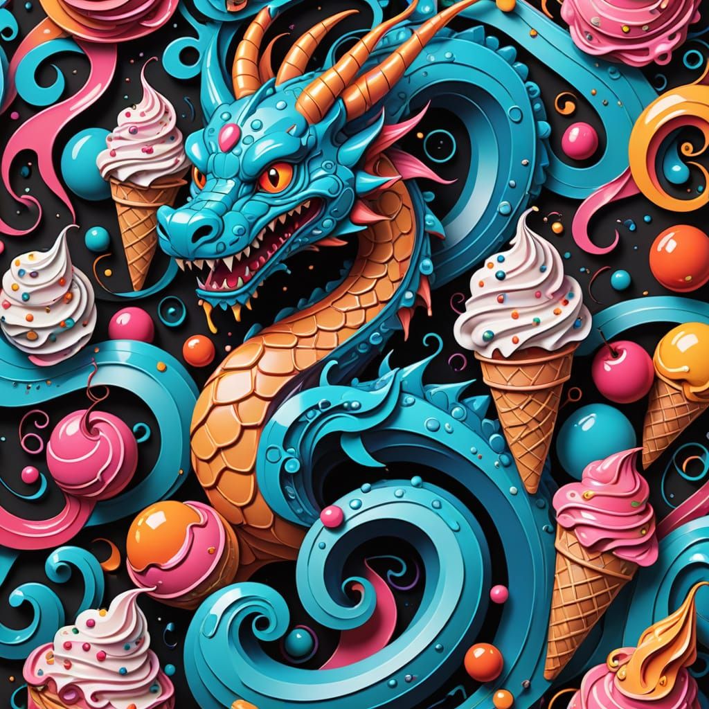 This colorful image features a close-up of a 3D ice cream dragon in a whimsical, swirly landscape, showcasing thick lines, geometric patterns, and bold black outlines in a playful new school tattoo style.