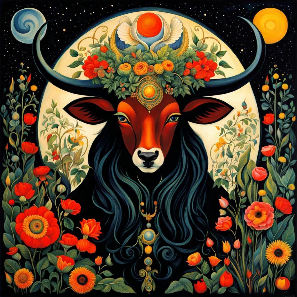 This image shows a gothic goddess in a cosmic setting. The artwork has a psychedelic and surreal aesthetic, reminiscent of anime and enchanted art, with occult and pagan influences.