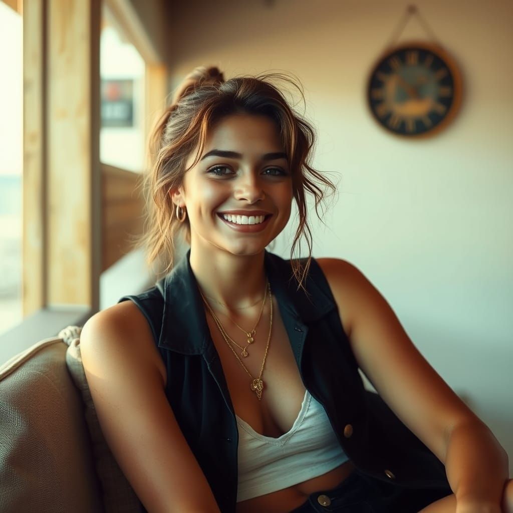 This image captures a carefree young woman posing in a relaxed beach setting, surrounded by soft pastel hues and a warm, sun-kissed glow, reminiscent of dreamy summer days
