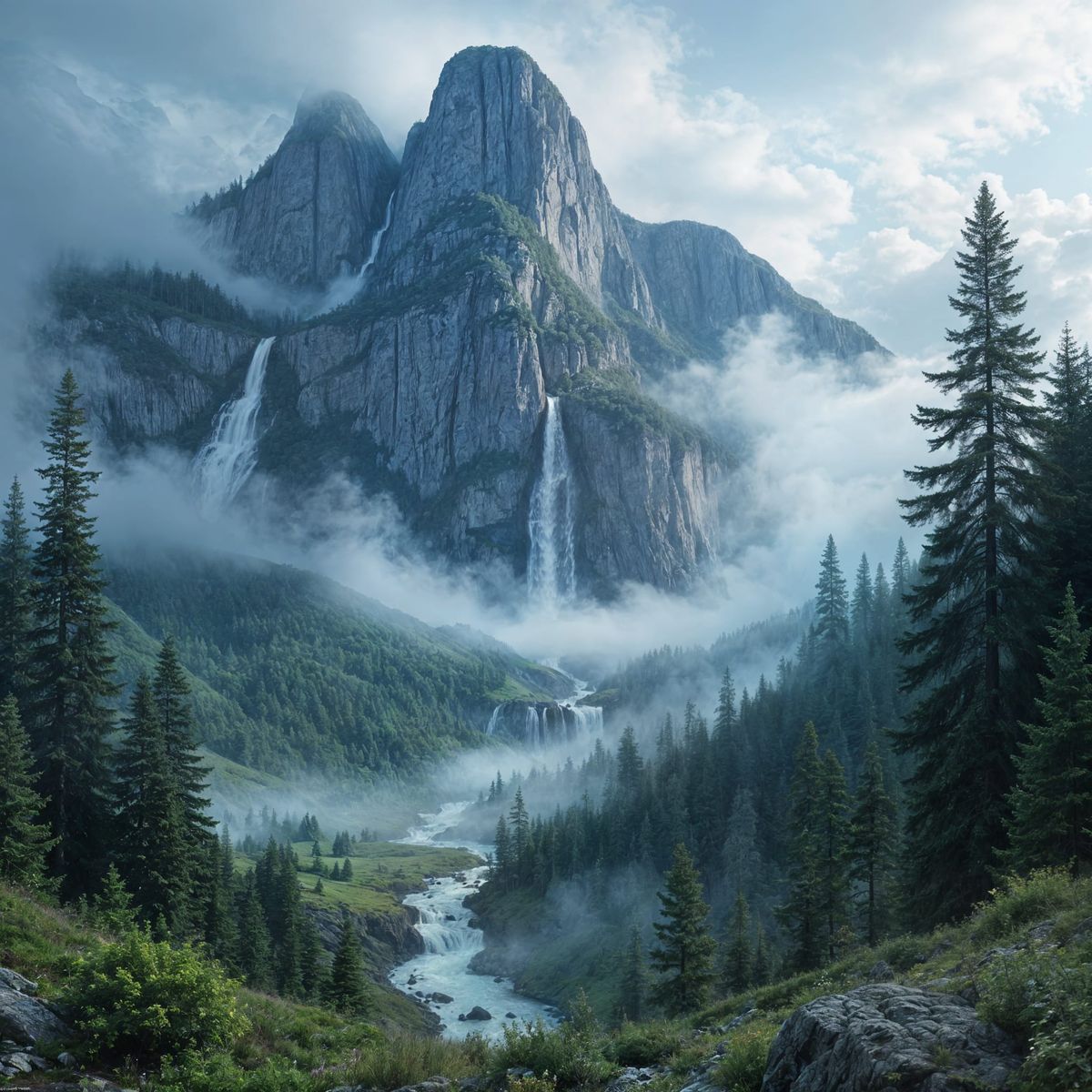 A breathtaking fantasy landscape of Jyläqua, the mountain of a thousand waterfalls. The image features rich colors and dramatic lighting, reminiscent of a vibrant dreamscape.