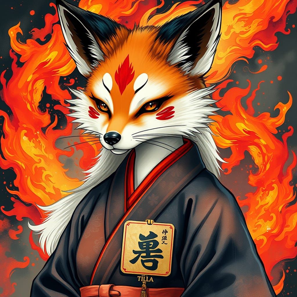 A captivating image of a kitsune in traditional Japanese dress. The artwork features vibrant fox fire and intricate details, rendered in a style reminiscent of modern pop art.