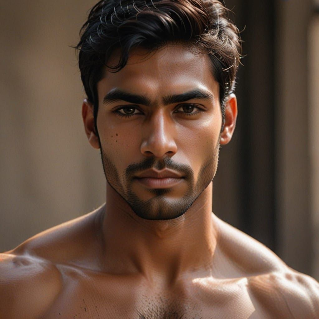 A hyperrealistic close-up captures the striking features of a 25-year-old South Indian man with smooth, medium-brown skin and expressive dark brown eyes. The soft, warm lighting accentuates his masculine appeal.