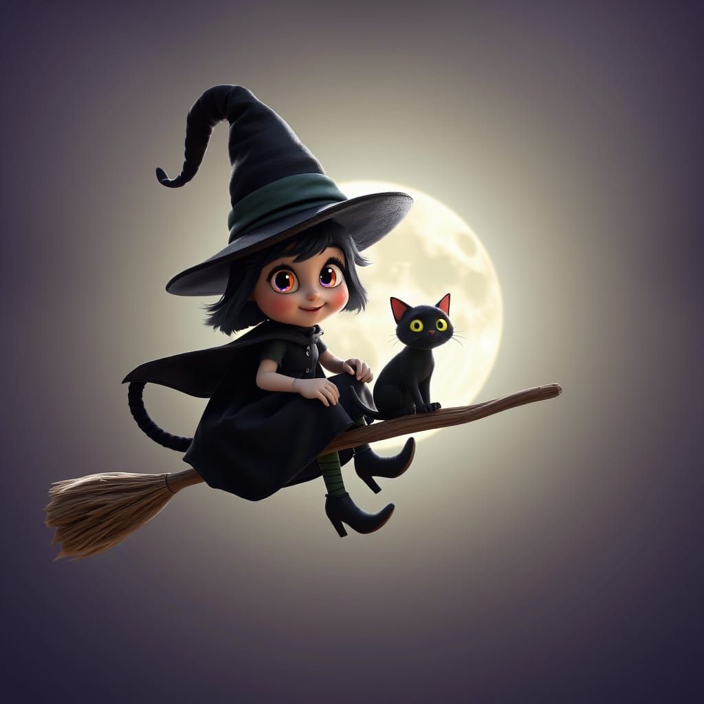This image shows an adorable witch with large, colorful eyes soaring on a broomstick with her black cat. The scene features a full moon and a radial gradient sky, rendered in a vibrant 3D digital art style.