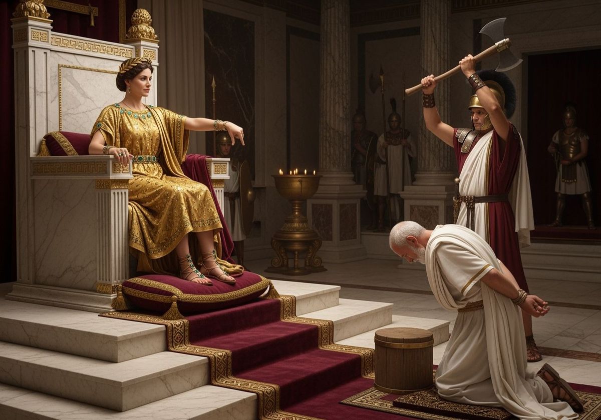 This image shows Empress Messalina of Rome seated on a lavish marble and gold throne in a grand palace. She wears a golden toga and emerald adornments, while a senator awaits execution before her. The scene is brightly lit with a wide view.