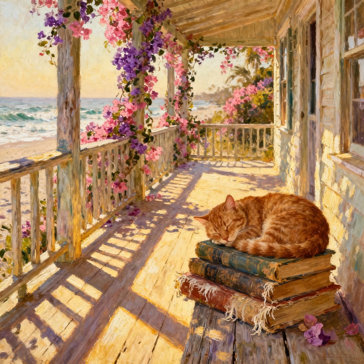 This image shows a ginger cat napping on books on the porch of a beach cottage. It is rendered in a warm, impressionistic oil painting style focusing on light and atmosphere.