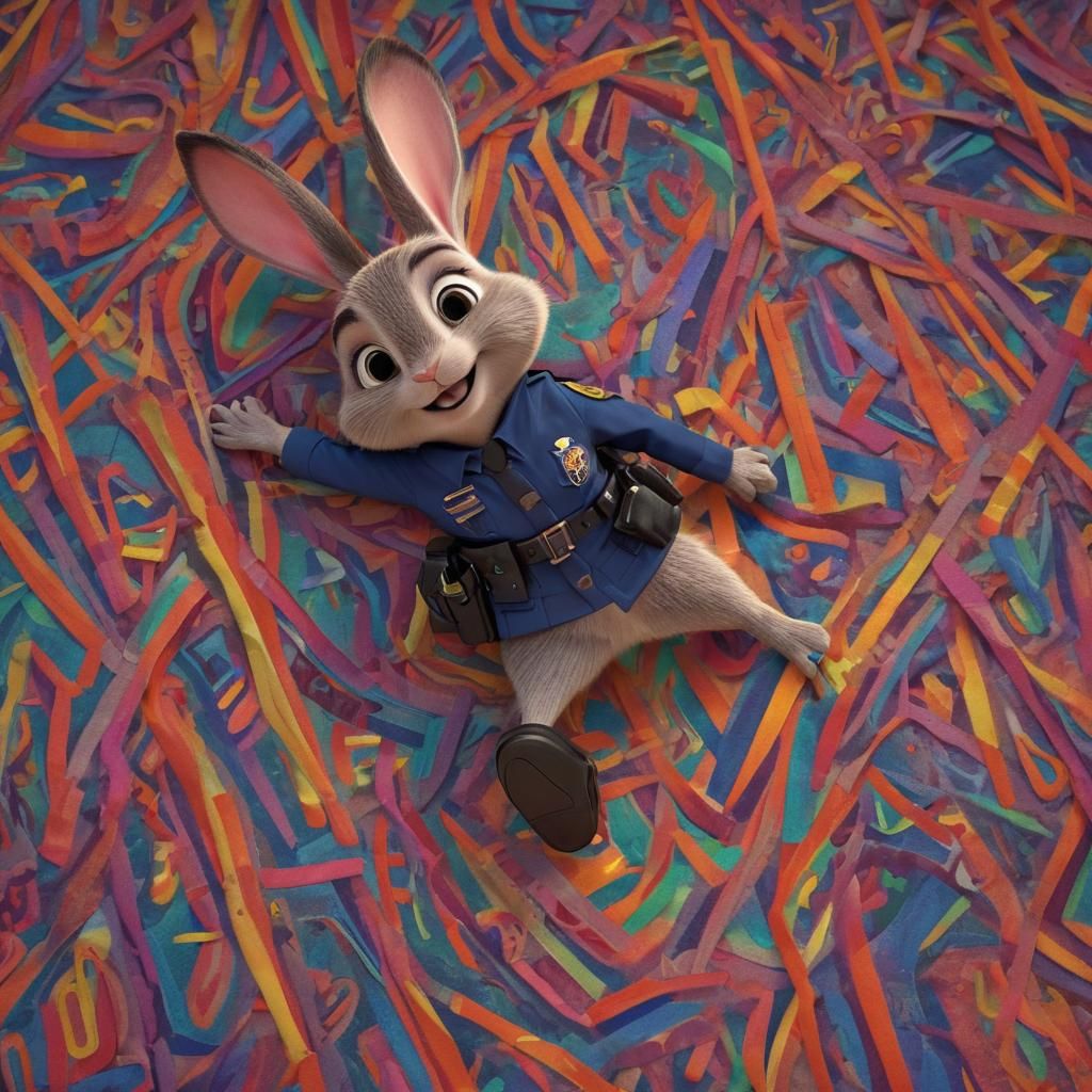 This image shows a vibrant, colorful room with a rabbit police officer removing her uniform and laying on a bed. The artwork features bold lines, exaggerated features, and bright, shimmering fabrics, with a warm glow and subtle lens flares. It showcases Pixar-style concept art with Disney flair, created ...