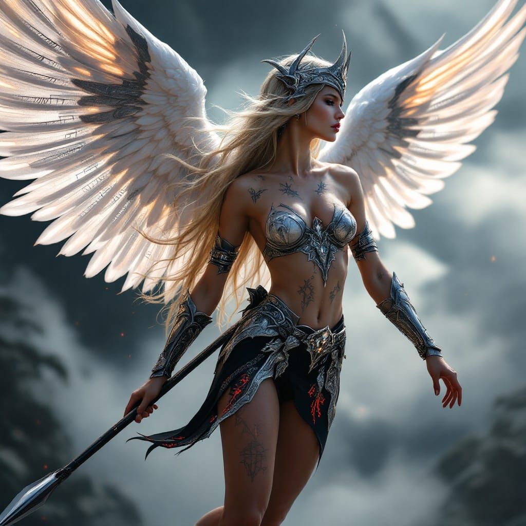 This image depicts a stunning female warrior in a futuristic, cyberpunk-inspired armor, with intricate bioluminescent tattoos illuminating her body in vibrant hues of white and red. Her athletic physique is accentuated by skintight silver armor, while her flowing blonde hair cascades down her back, adorn...