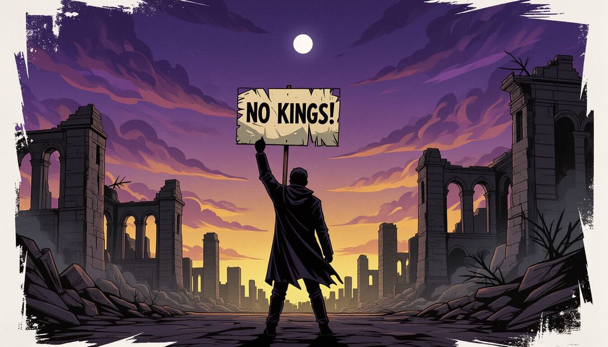 This illustration shows a lone figure with a protest sign in a decaying city under a dark purple sky. It features dramatic lighting and a desaturated palette, evoking themes of societal critique.