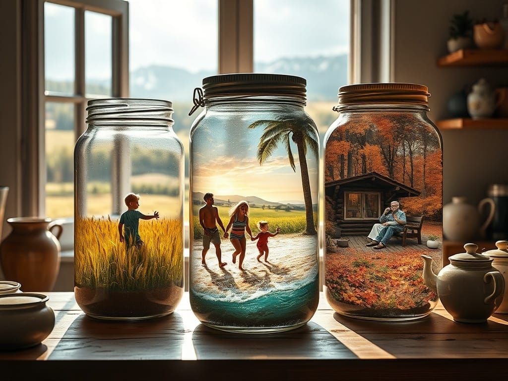 This photorealistic image showcases a cozy kitchen with jars containing scenes of spring, summer, and autumn, bathed in volumetric light.