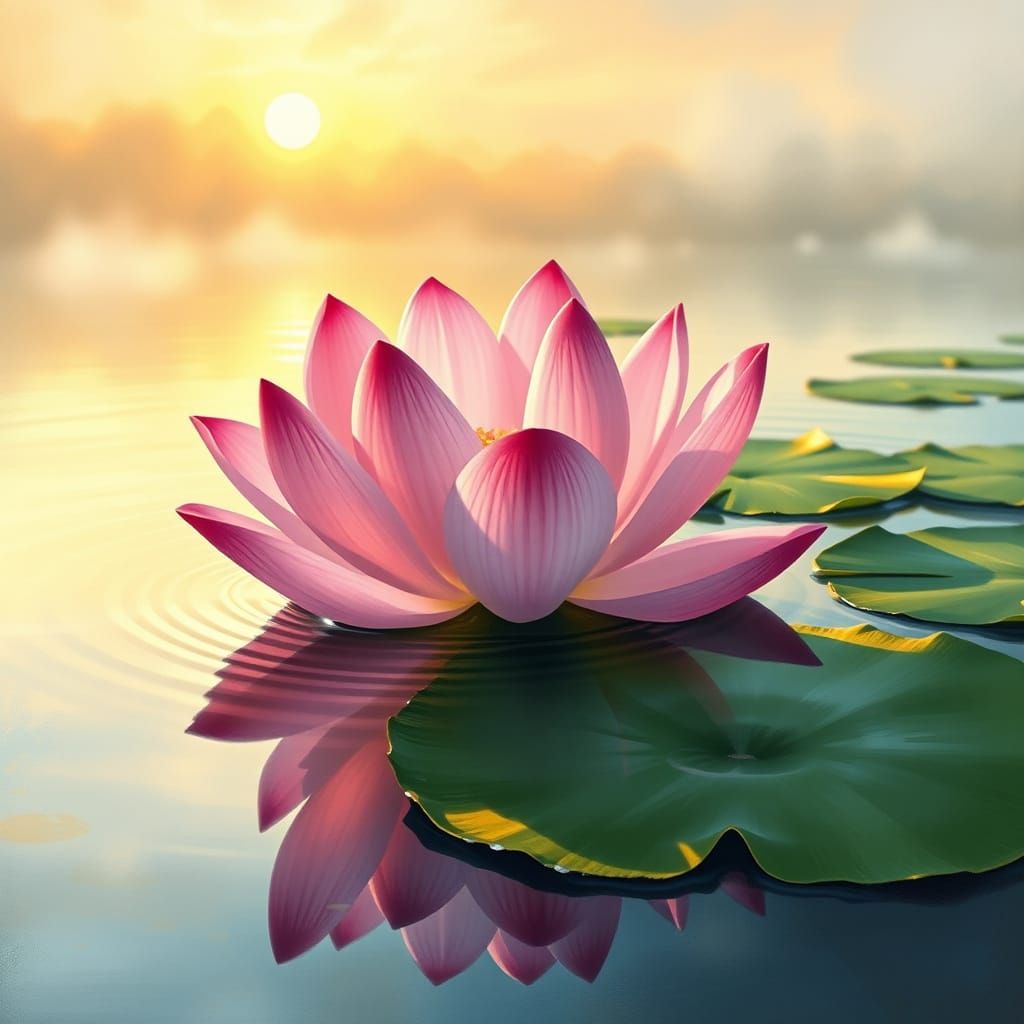 A striking picture of a pink lotus flower on a tranquil pond at dawn. The soft light enhances the beauty of the flower, which is captured with thick, textured brushstrokes in a dreamy gouache style.
