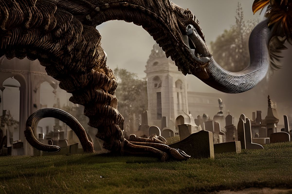 A photorealistic image of a mongoose cobra beast towering over a graveyard. The intricate details are rendered in 8k with octane rendering.