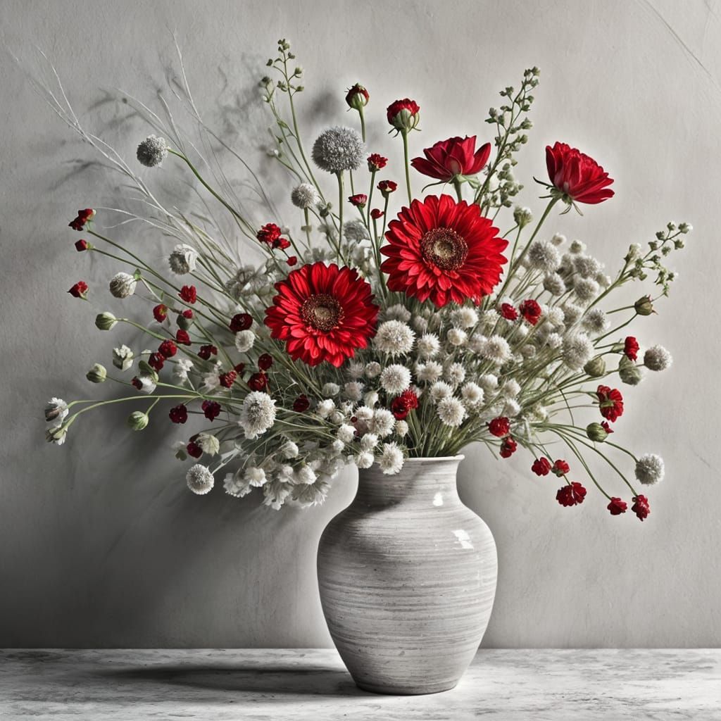 A black and white still life photograph of a vase overflowing with a mix of fresh and dried flowers, with one prominent red flower. The image is highly detailed with an elegant, transparent aesthetic.
