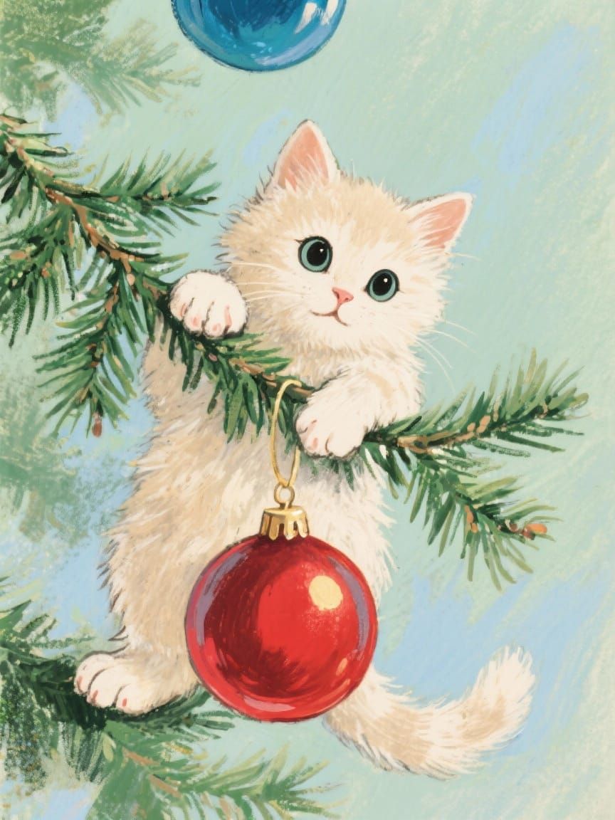This image showcases a charming vintage Christmas illustration of a cute, fluffy kitten clinging to a festive green tree branch, reminiscent of 1950s greeting card art. Features bright ornaments and a soft pastel background.