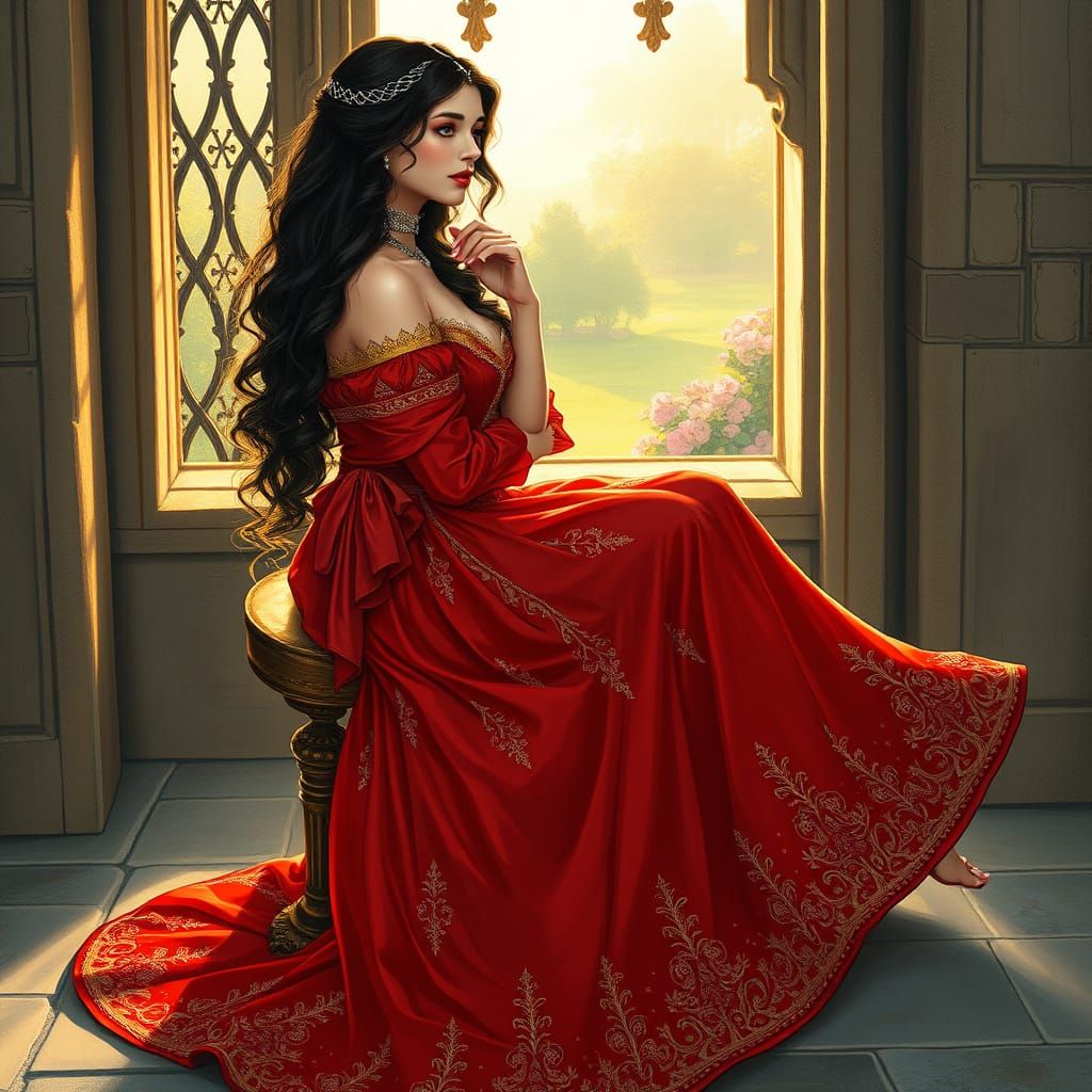 A regal woman sits on an ornate stool, surrounded by soft light and elegant trims, with a subtle mysticism reminiscent of Art Nouveau masters