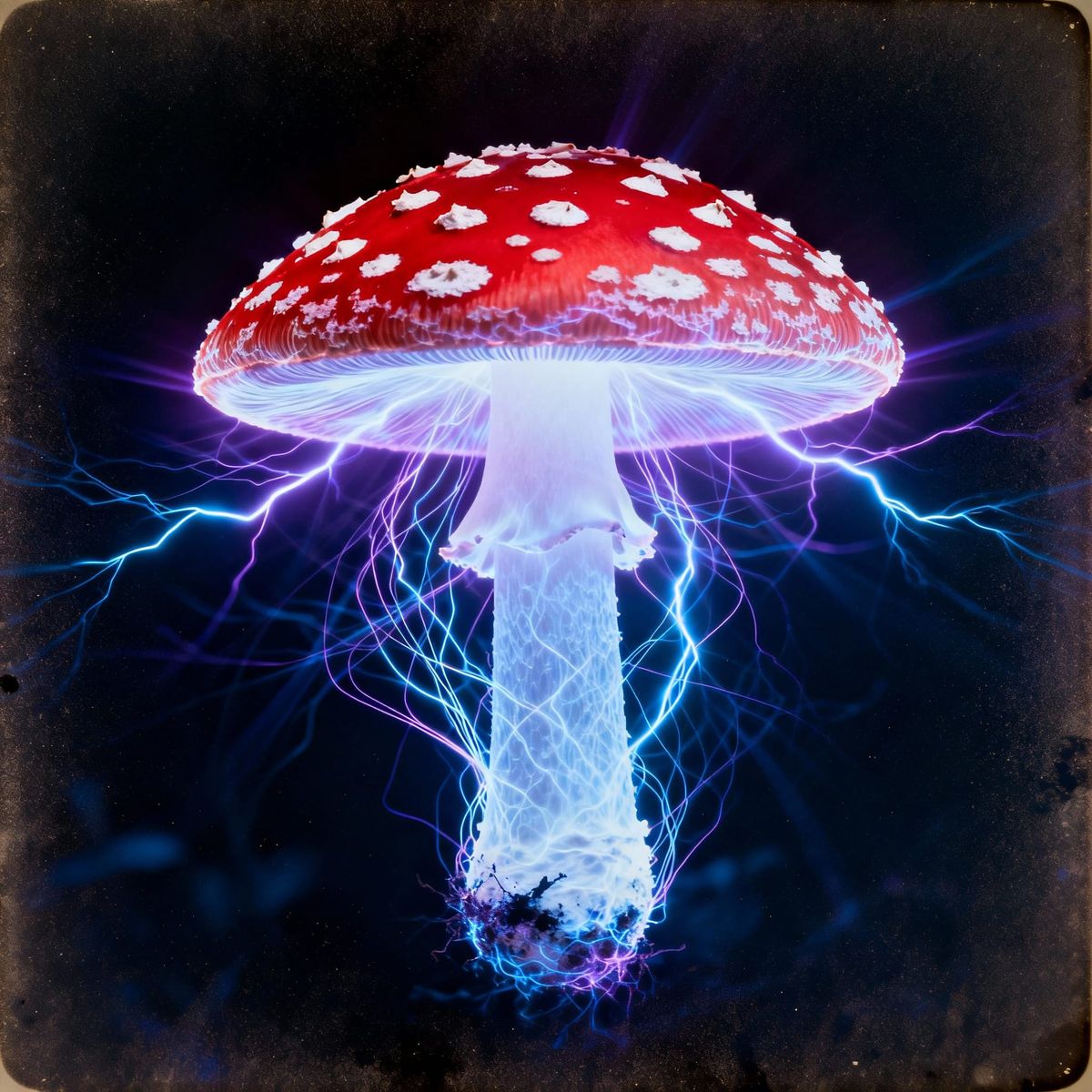 This image showcases a vibrant red and white mushroom captured with Kirlian photography, revealing an ethereal glow of electric blue and purple energy. Intricate, hyperdetailed filaments surround the fungi, evoking a sense of otherworldly luminescence and scientific wonder.