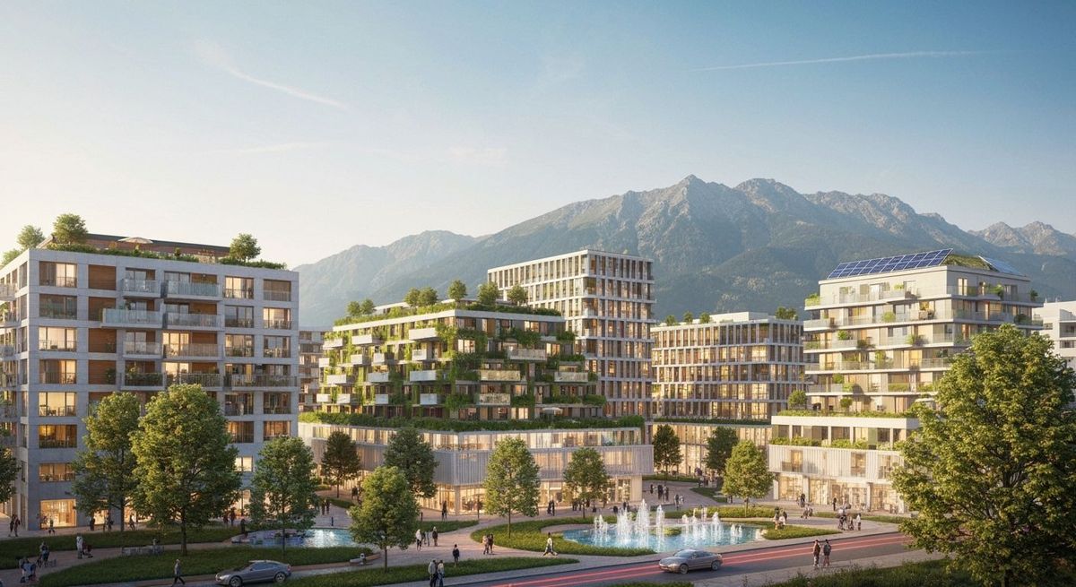 This image showcases a futuristic, eco-friendly city in Innsbruck, Austria, featuring mid-rise buildings with green facades, balconies, and rooftop gardens, set against mountains. Rendered in a photorealistic style with cinematic lighting.