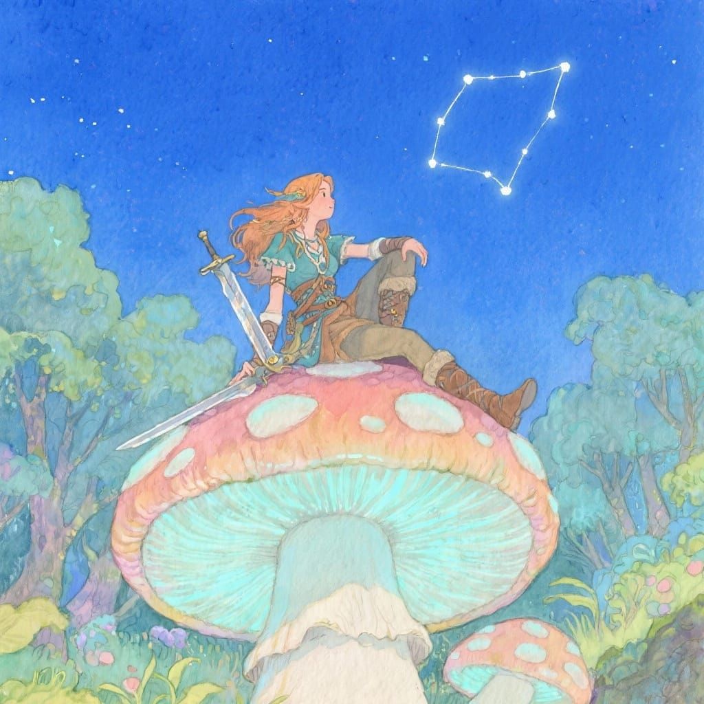 This image shows a whimsical adventurer sitting atop a giant, glowing mushroom. The pastel watercolor painting features a clear night sky with a prominent constellation and a dreamlike, enchanted forest setting.
