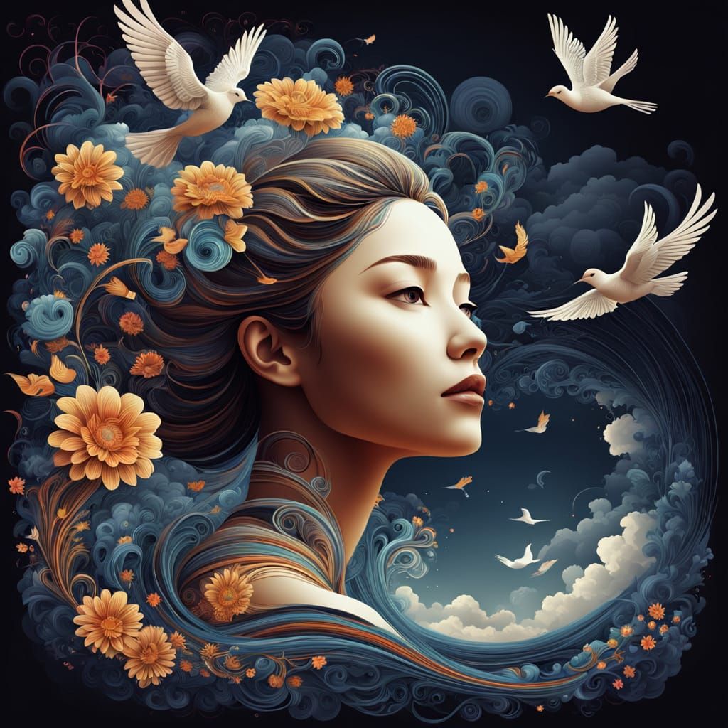 A mesmerizing abstract portrait of a woman, surrounded by stylized clouds, flowers, and birds, set against a dark background that pulses with energy and vitality, created using fractal and 3D shading techniques.
