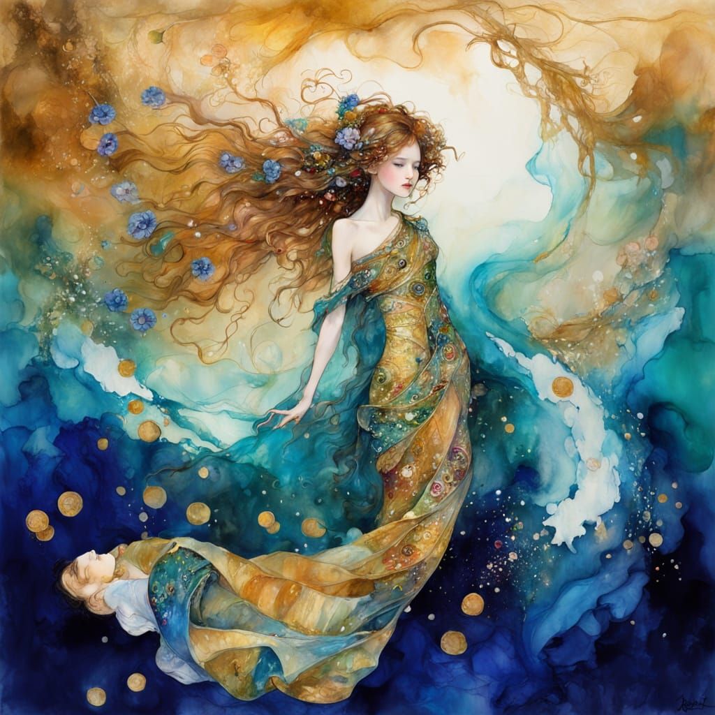 This image shows a coy girl in an artistic style reminiscent of alcohol ink techniques. The artwork features a blend of flowing colors and abstract forms.