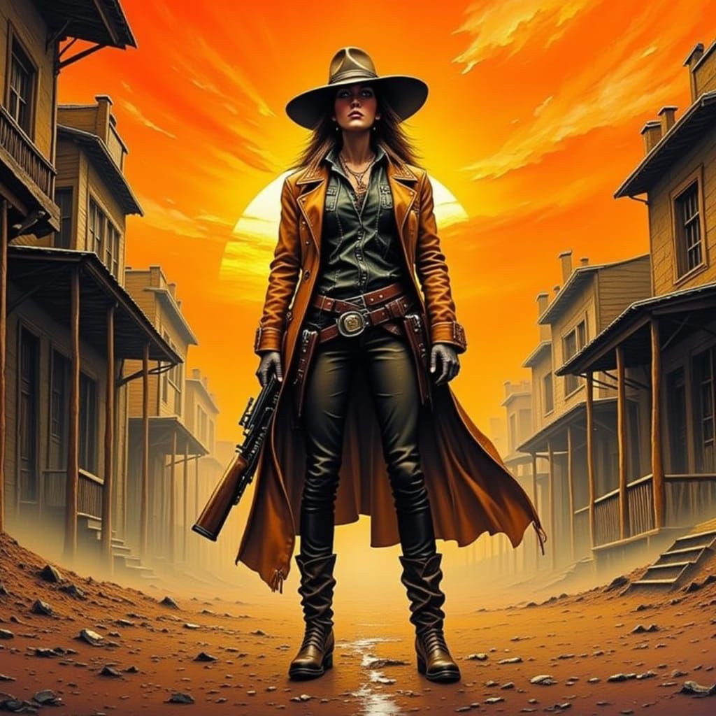 A striking picture of a female outlaw in the Wild West, standing in a deserted ghost town as the sun sets. She wears a duster coat, Western hat, and cowboy boots, and is armed with pistols and a rifle.