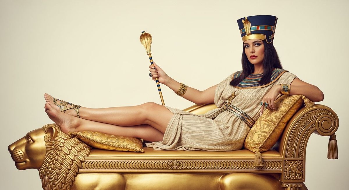 A photorealistic image depicting a beautiful Egyptian Queen in a gold toga, adorned with rings and a cobra crown. She lounges barefoot on a lion-shaped chaise longue in a photorealistic style with natural lighting.