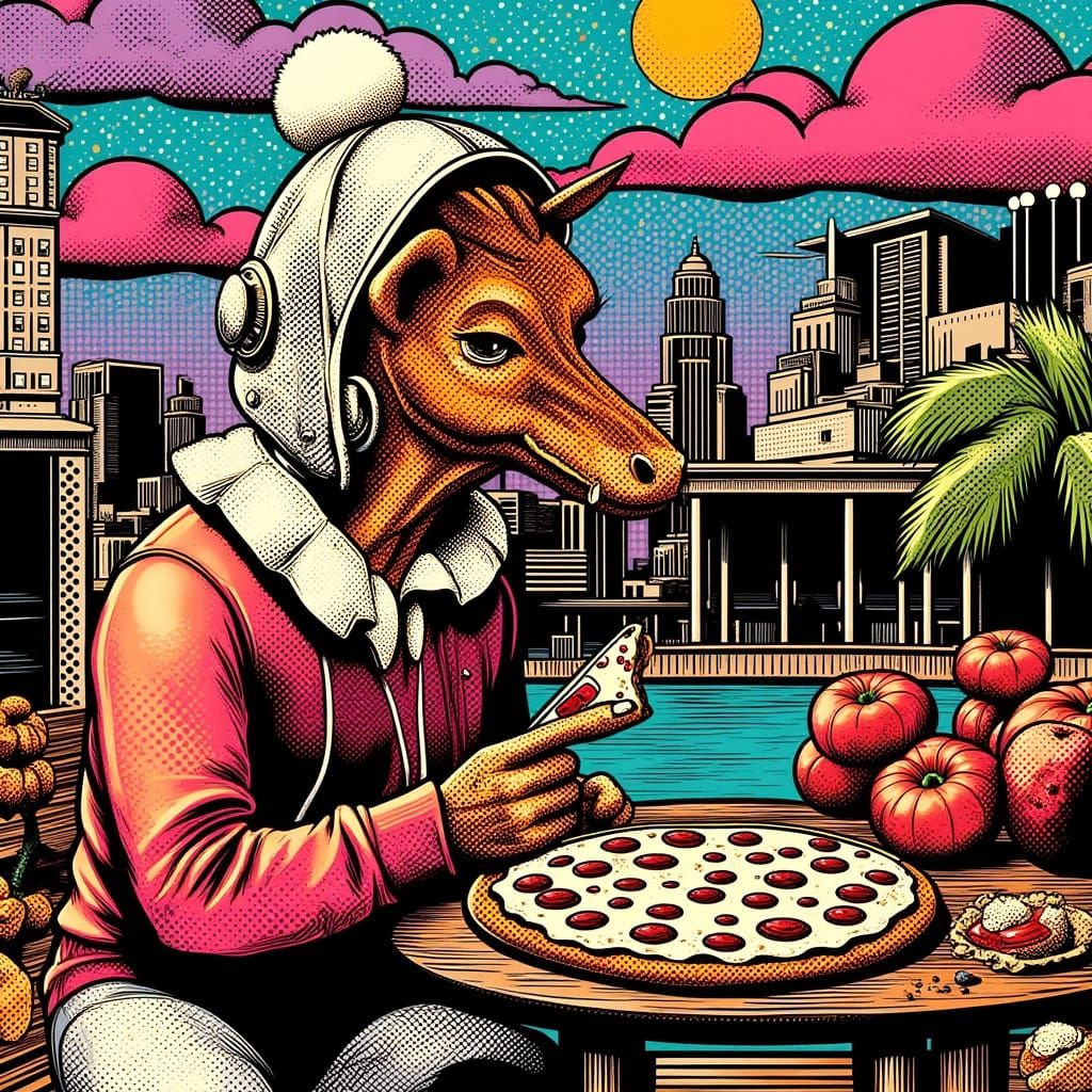 A vibrant comic book image of a cat dragon in an 80's outfit eating pizza. Graffiti, splash art, and spray paint textures create a colorful, high-contrast scene with melting oil gouache effects.