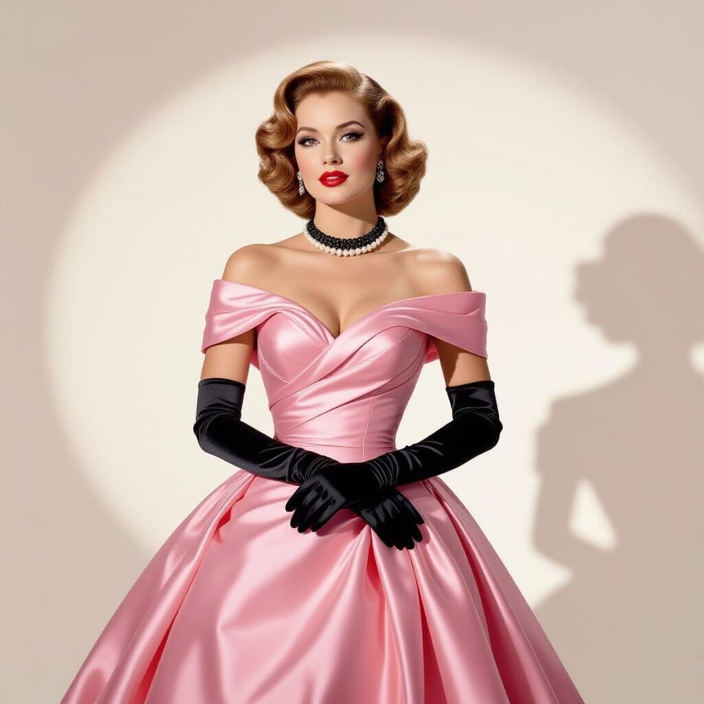 A stunning image of a Hollywood actress in a pink satin gown and black accessories. The photo is reminiscent of high-fashion editorial photography with vintage studio lighting.