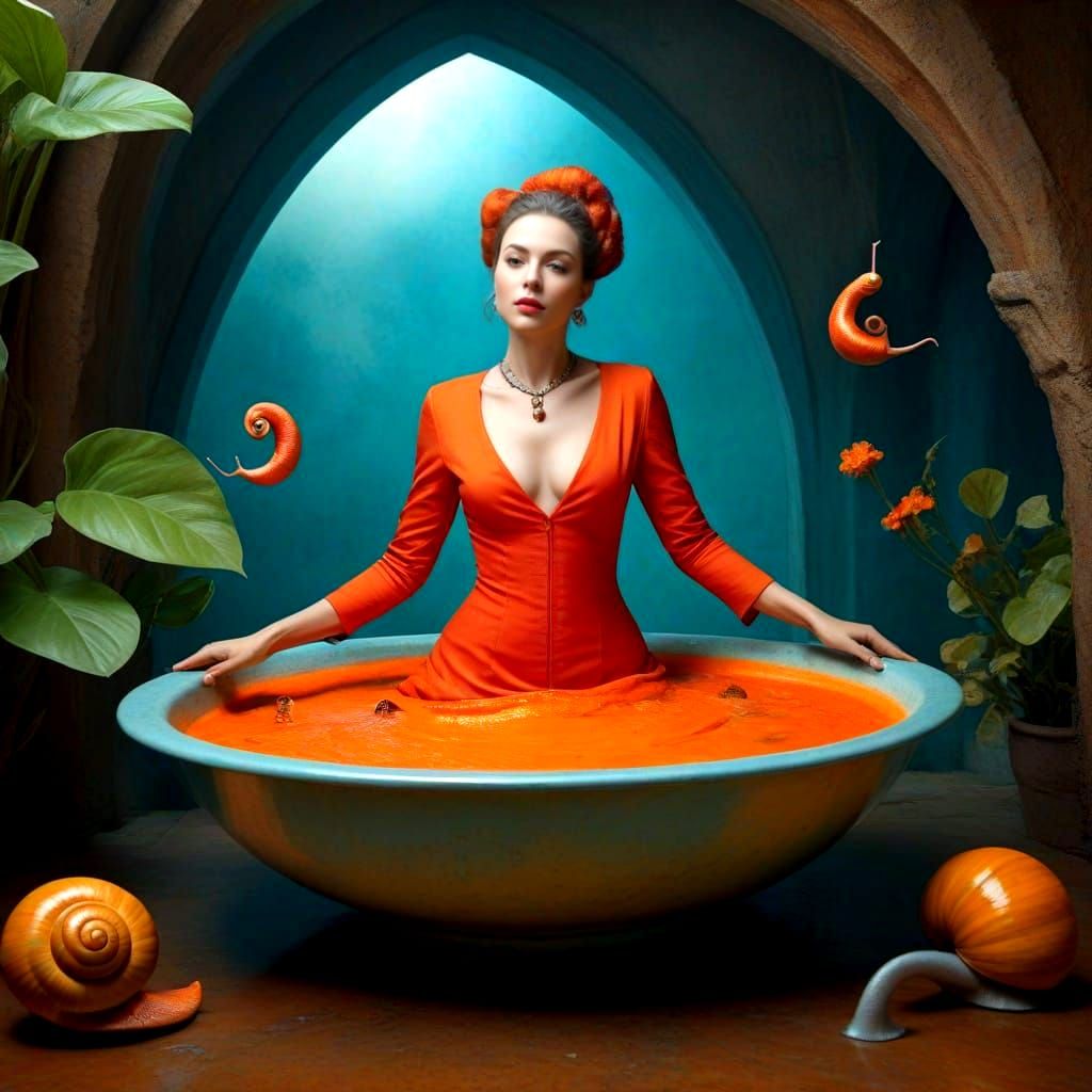 highly expressive photorealistic full-height image of charming mature medieval lady in active movement in complex strange fantastic surrealistic scene, fantasy, surrealism, photorealism, hyperrealism, minimalism, crisp image, precise, detailed, textured, vivid vibrant colors, intense contrasting colors, ...