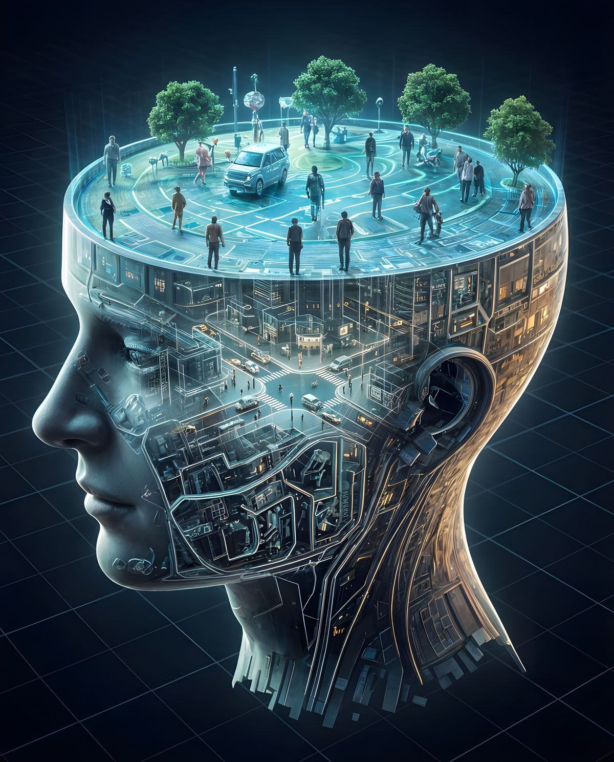 This hyperrealistic 3D digital art depicts a detailed holographic cutaway schematic of a bustling city, representing a civilization thriving within one's mind.