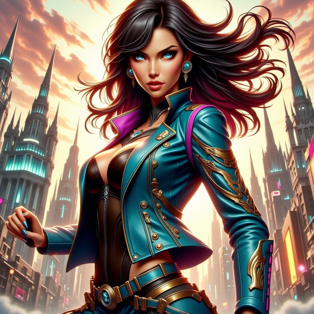 Anime hyperrealistic, ultra-detailed portrait of a powerful, badass woman embodying the fierce spirit of a Gemini zodiac sign. She stands tall and commanding posture, her gaze intense and unflinching, eyes glowing with a silver chrome hue that seems to flicker like embers. Her skin has a warm sun-kissed ...