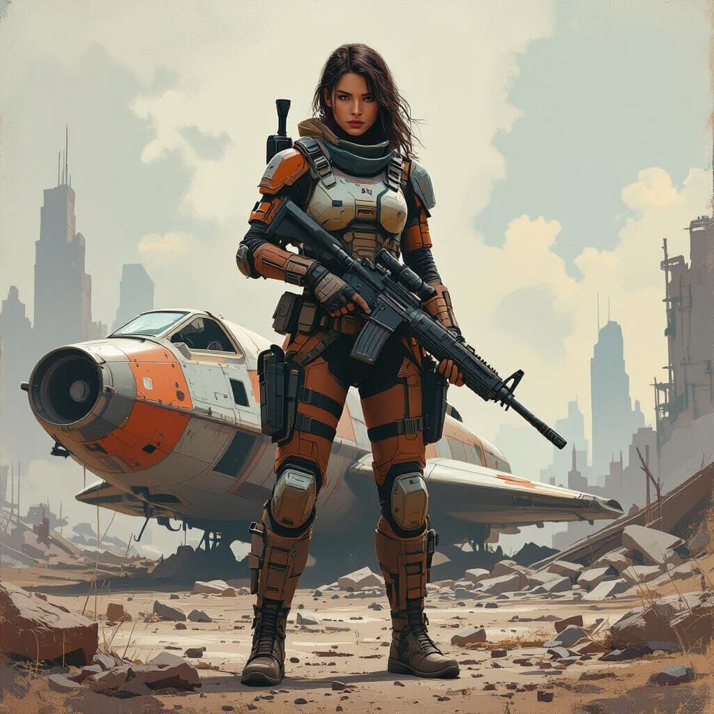 This image shows a female sci-fi explorer in combat gear, confidently posed before a vintage spacecraft. A ruined cityscape forms the backdrop, rendered with textured brushstrokes and atmospheric lighting in earthy tones.