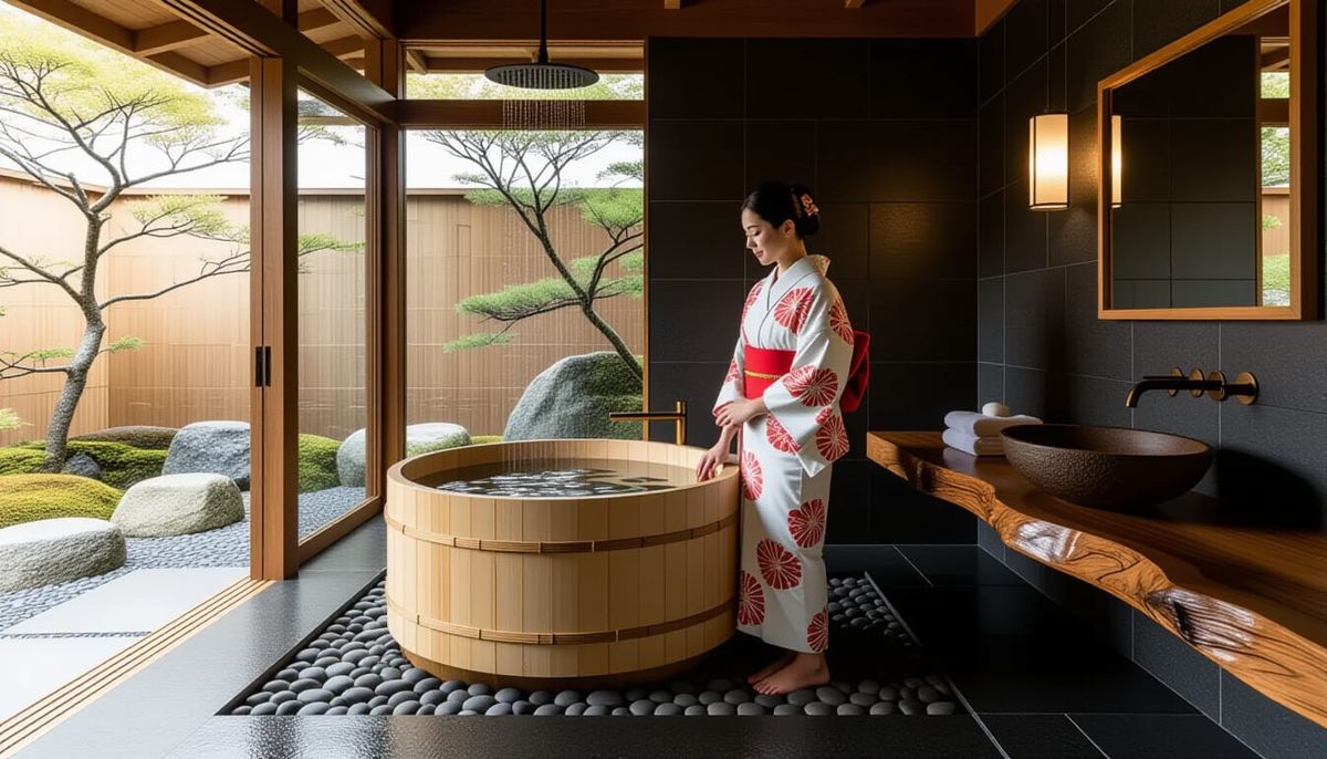 A serene woman enters a traditional Japanese Zen bathroom. The room features a hinoki soaking tub, river stones, a live-edge vanity, and soft lighting, creating a rustic, natural atmosphere.