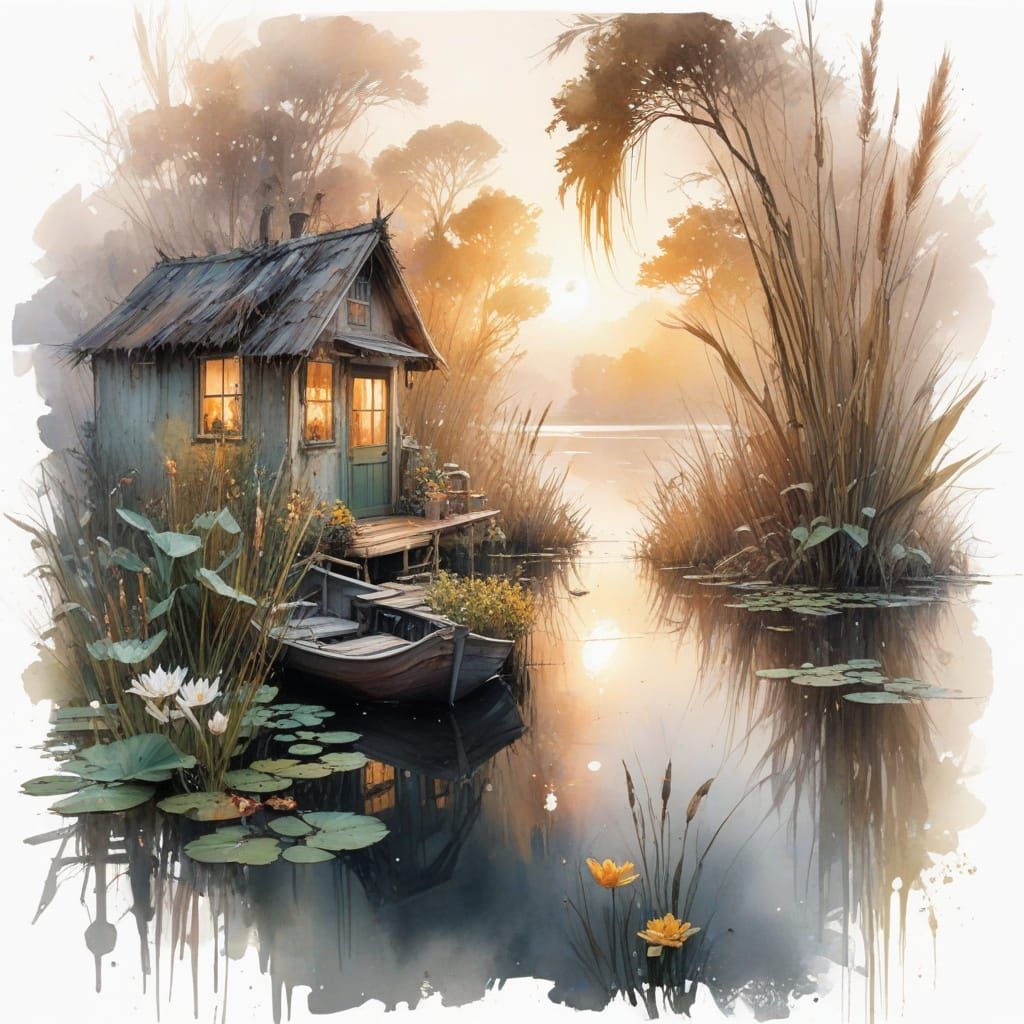 A charming image shows a houseboat nestled in a serene, misty lake at sunrise. Golden light filters through the fog, illuminating the tranquil scene in a dreamy, watercolor style.