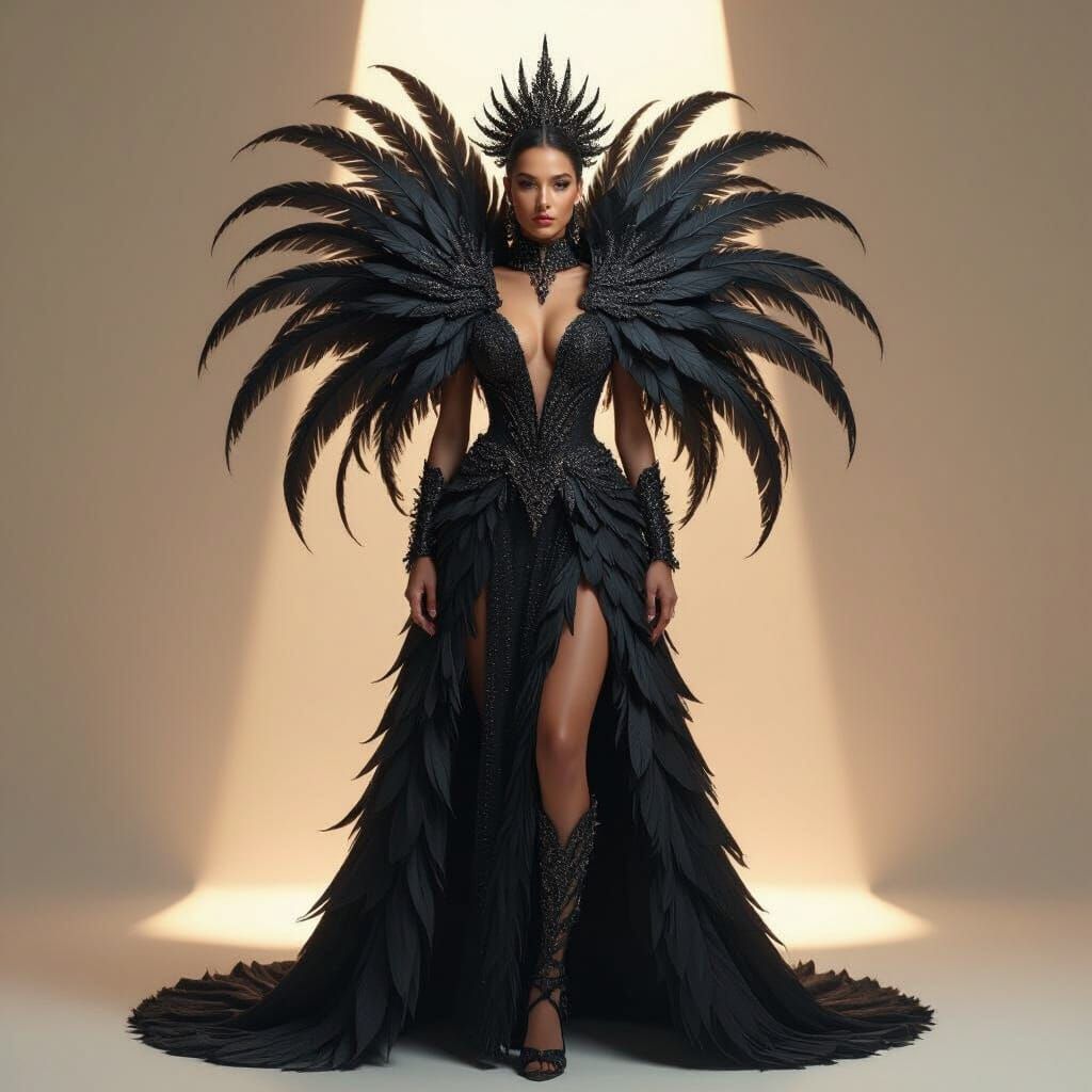 This image shows a woman in an elaborate feathered gown. The dark fantasy style is accentuated by dramatic lighting and subtle sparkles, creating a striking and regal aesthetic.