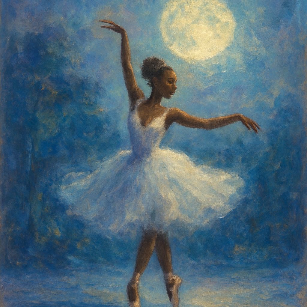 A captivating image of an African American ballerina dancing on a moonlit stage. The scene evokes magic and wonder, portrayed with delicate brushstrokes and a dreamy atmosphere in an impressionistic style.