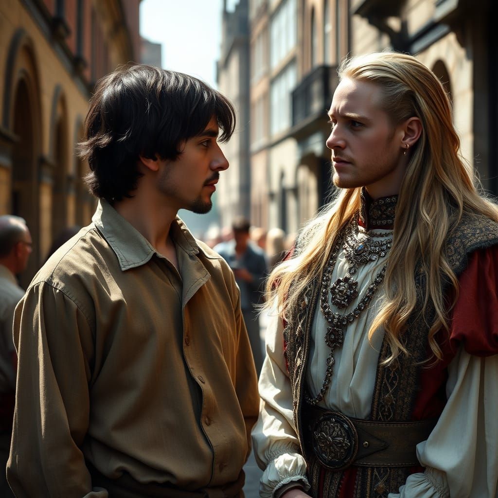 This image shows William Shakespeare and the Earl of Southampton in Renaissance London. The cinematic film still captures the essence of a 35mm film with warm film grain and dramatic lighting.