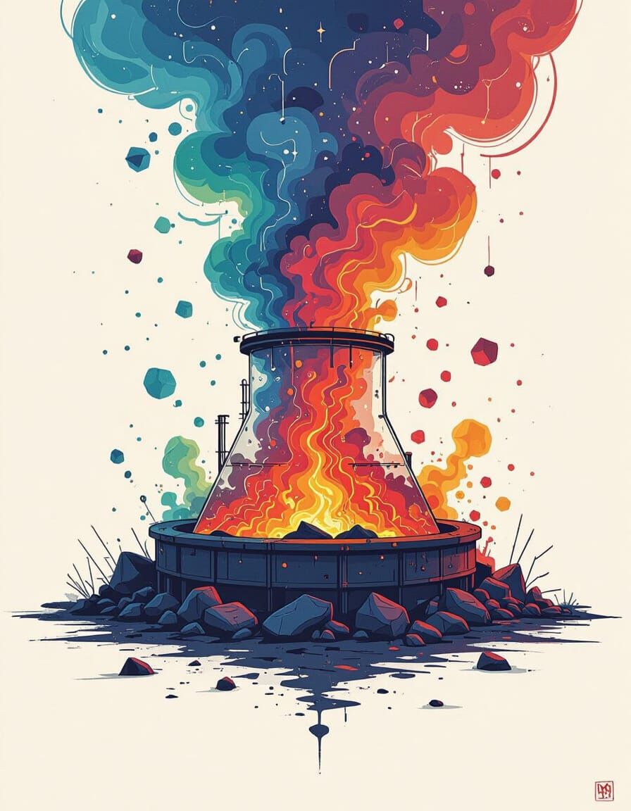 This image shows the pyrolysis of oily sludge in a laboratory reactor. The process is visualized with colored vapors and various mineral particles, depicted with clean lines and subtle textures in a semi-realistic style.