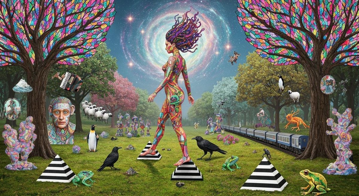 This image shows a mystical woman walking on black and white pyramids with micro plants. The surreal scene includes cracked mirrors, distorted realities, and glowing frogs in a vibrant collage style.